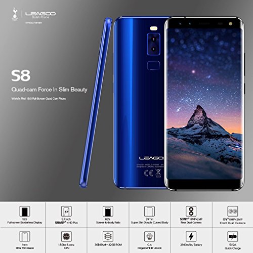 Smartphone 4G Libres, LEAGOO S8 de 5.72" (18:9) Móviles Baratos Android 7.0 (Cuatro Cámaras 13MP+2MP&8MP+2MP, 3GB RAM+32GB ROM, MT6750T Octa Core, Dual Sim, Batería 2940mAh, Huella Digital)